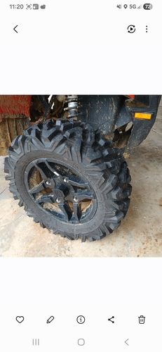 26x10x14 and 26x8x14 .came off a new polaris 570 trail edition.put them on my older bike but grand daughter wanted 30's