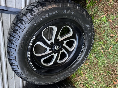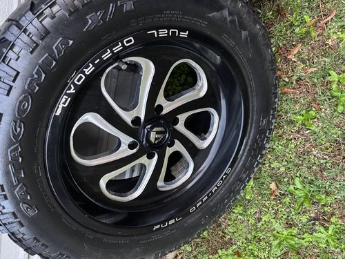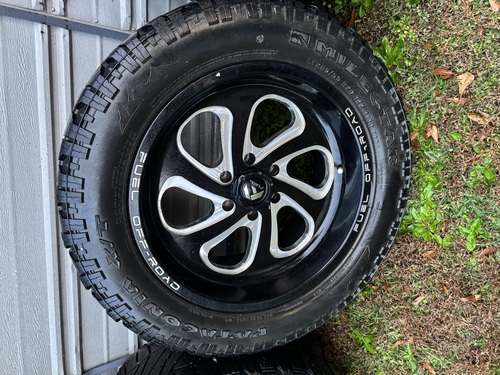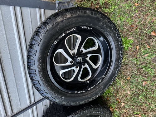 33 inch tires and 20 inch inch wheels for Toyota or Chevrolet. Do not have all the lugs due to the shop who took them off ruining some and not giving them all back. You can replace them from a local auto parts store or get some from EBay.