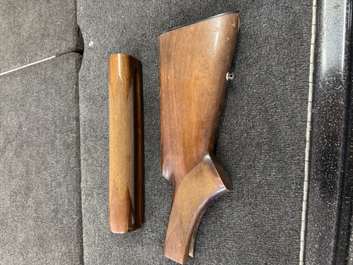12 Ga. A5 butt stock has chip and some scratches but no cracks. The foreend checkering is perfect, some scratches but no cracks