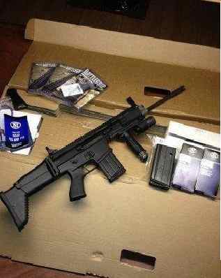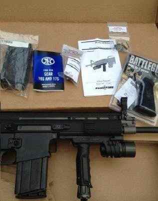 FN Scar 17 S with 4 factory steel mags also comes With new surefire M 900 A verticle fore grip with swing lever rail clamp. This surefire set up also has Blue Led lights for Navigation. The gun also has tango down battle grip and side panels.