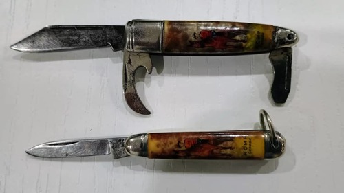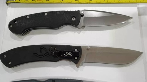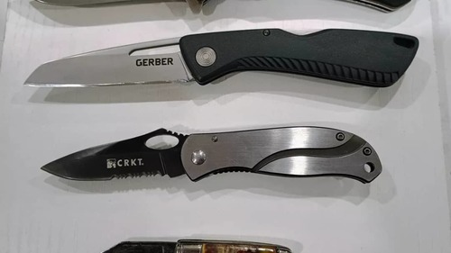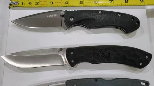 Top to Bottom: 1) Gerber Profile--Model 22-01297 Discontinued Model-Large titanium coated drop point blade - factory edge. Soft rubberized nonslip handles. No Pocket Clip. Locks up tight with no rock or wobble. Blade 3 1/2 ", Closed 4 3/4", OAL 8 1/2". Original Nylon Sheath Included. Doesn't look like it's been carried much. ($35) 2) Browning Large Primal Liner Lock--Stainless steel 8Cr13 Blade with Rubber Handle and short deep carry pocket clip. Dual thumbstuds and flipper tab (doesn't flip without wrist action). Nice action with thumbstuds. Locks up tight. Clean sharp blade. Blade 3 3/4 ", Closed 5", OAL 8 3/4" ($25) 3) Gerber USA Sharkbelly Lockback 1409N with Half Stop--USA made lightweight lock back with half stop. 420HC steel sheepsfoot style blade. Textured glass reinforced nylon handles with wire pocket clip and lanyard hole. Nice snap on open, half stop and close. Blade 3 1/2 ", Closed 4 3/4", OAL 7 3/4". Lightly used condition--clean sharp blade ($SOLD) 4) CRKT Pazota Linerlock--2 3/4" spear point half serrated blade--titanium nitride coated--Sharp! OAL 6 1/2", Closed 3/ 3/4". Frame lock, Stainless Scales. Tip down pocket clip. Nice used condition ($SOLD). 5) Richards "Lampost" Sheffield Mountie Folders-- 2 1/8" closed, 1 1/2" blade-- multi blades--no cracks on scales--good springs--missing bail 1 7/8"closed--1 1/4" single blade--no cracks on scales--slight wobble--good spring