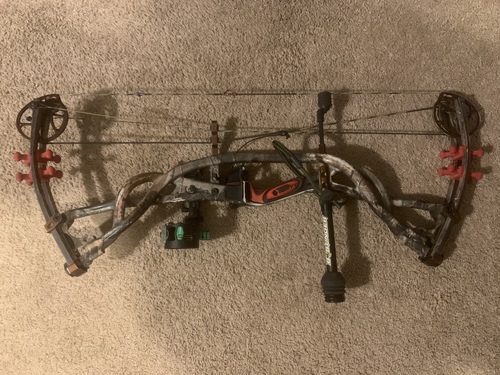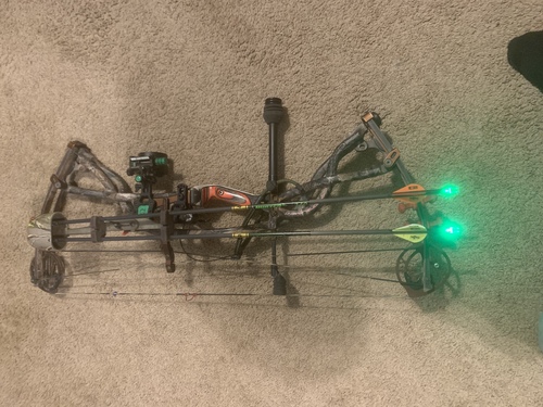 40-80 lbs DW, 24.5-30” DL, have several different cam modules that come with it. Bow has wear but New Strings and cables. Includes different grips, NEW IQ BOW SIGHT, Rip Cord drop away, Stinger Stabilizer, 2 gold tip arrows with lumen knocks (green), Swacker Broad-heads, And much more