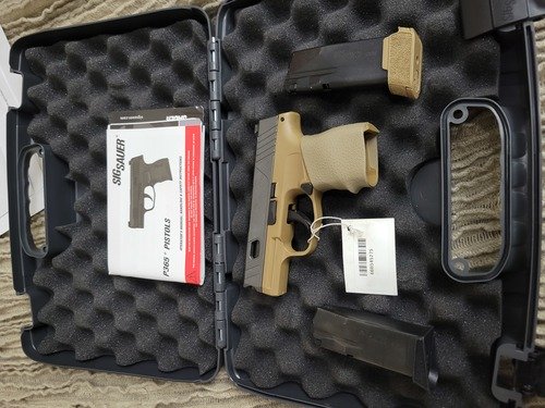 Like New Sig Sauer P365 Auto Pistol in 9mm in Coyote Tan with both 10 and 12 rd magazines. Has matching Hogue Grip. Comes with 12 Rd Mag. $649 870-814-5881.