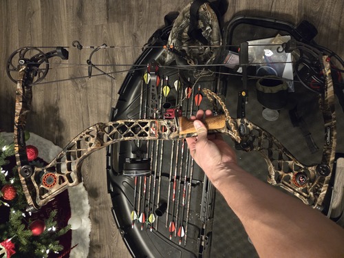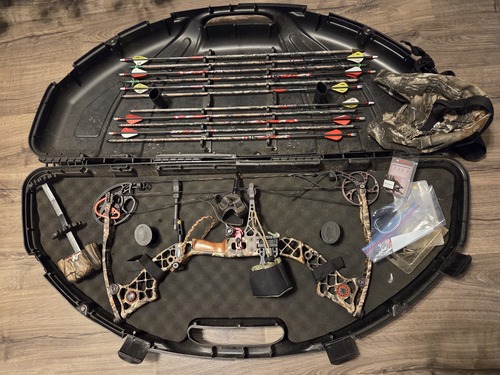 Mathews z7 extreme 29 inch draw and 65lb draw weight, QAD fall-away rest, Spot Hogg real deal 3 pin sight, 5 Carbon Express Maxima and 6 Carbon Express Stryker MX arrows, 3 Swacker 100 gr broadheads and 5 fuzzy 100 gr broadheads, extra field points, Scott release, bow sling, bow case