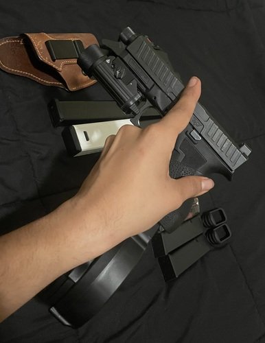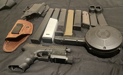 PSA Dagger Compact in good condition, ready to go. Black frame/slide with Hogue grip. Includes Braun 1000 lumen light, 9 mags (17–50rd, ETS, Glock, Kriss, KCI drum), and 2 IWB holsters (leather + Kydex for light). Solid range or carry setup. Open to offers or trades.