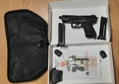 Ruger SR 22 semi auto 22 LR. 2 Mags with threaded adapter plus normal barrel nut. Comes with box, manual, and carry bag.
