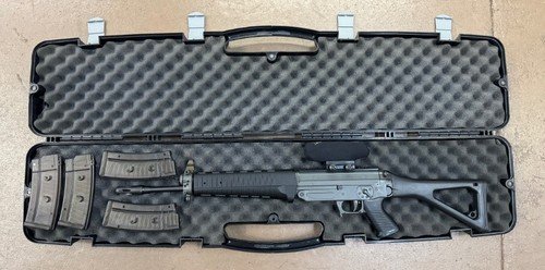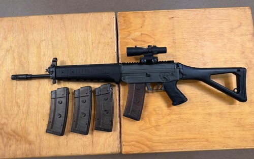 Sig 551A1 in 5.56.you don't see these as often anymore and this one is in really nice shape! It comes in the original case with 4 magazines and a trijicon acog TA33-H. The acog is really nice but it does seem like the glass is not as clear as they normally are. Perhaps biteigen leaked out. No TRADE