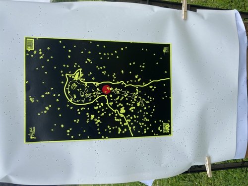 Stevens 301, 20 gauge with firefield red/green dot sight. Pattern picture is with #9 tss at 40 yards with the stock turkey choke that comes with it.