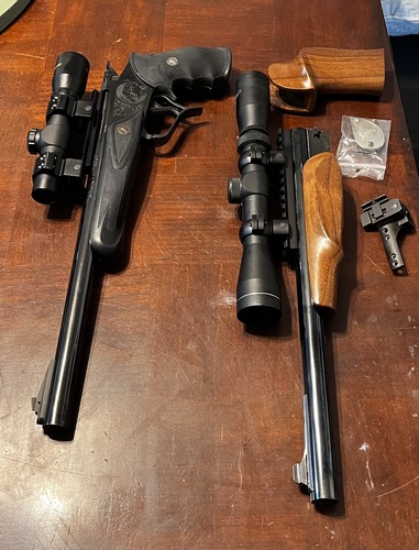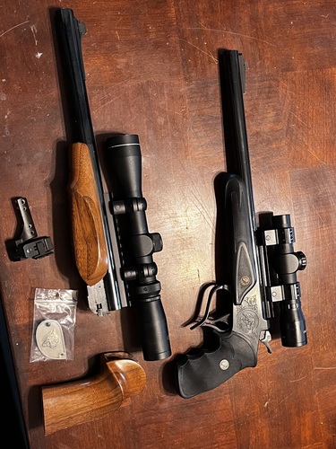 For sale or trade! Thompson Contender Super 14 with original wood furniture and new Pachmyr Decelerator grip and forearm. Comes with 30/30 win barrel and 44 magnum barrel and two scopes.