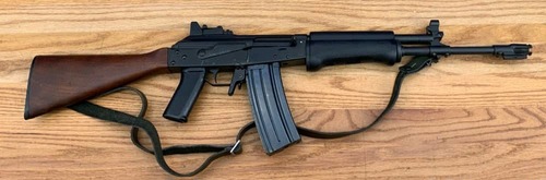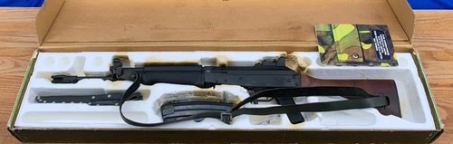 This collector grade VALMET AK-47 M76 semi automatic riffle chambered in .223 Remington cartridge on the upper and lower receiver, adjustable rear smooth Woodstock,checkered pistol grip, black fore-end attached sling. Complete package comes with original box paper, bayonet and seath and one magazine