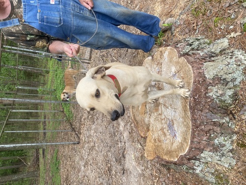 Half black mouth cur dog. Comes from hog dog stock.