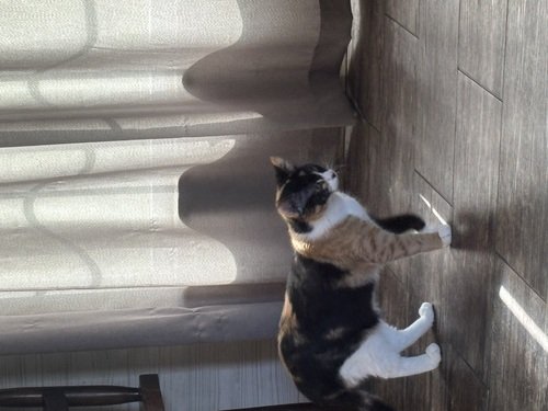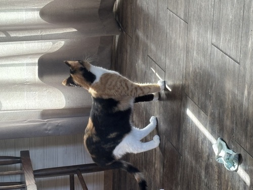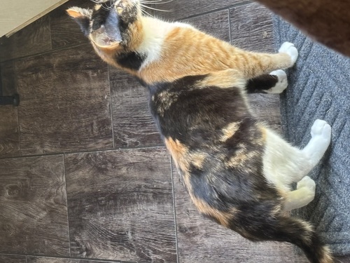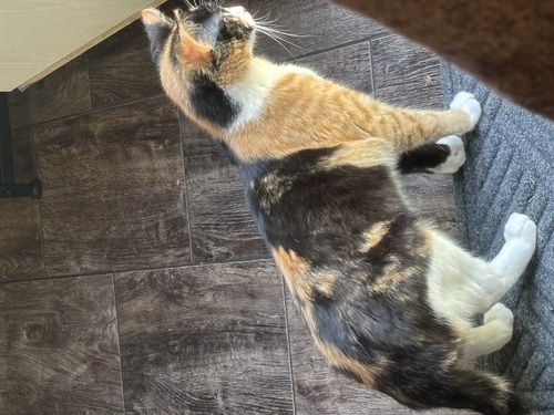 Very sweet female calico. Under a year. Loves kids, good with our dogs. Loves my daughter and good with her. Shy at first. Husband is very allergic. Inside home only please.