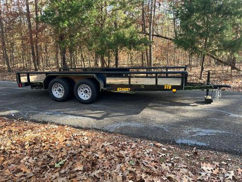 16 Ft. Kearney Trailer, pipe top, tandem 3500 lb. axles, one brake axle, slide-in ramps, bull dog hitch coupler for 2 inch ball, treated floor, and matching spare tire. Like new. Year model 2023.
