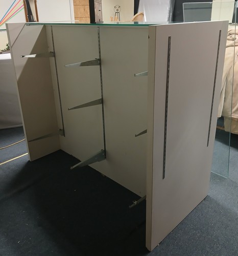 Heavy duty display with 2 sides and has shelving at each end. Glass shelves are included.