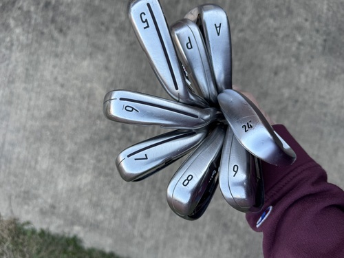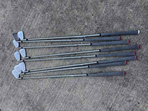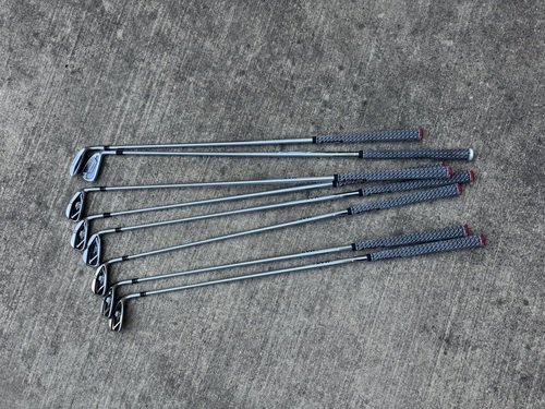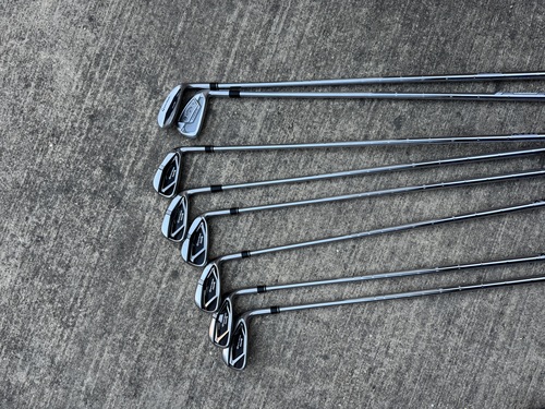 Taylormade m4 irons; 5-P, A; stiff flex kbs max shaft; midsize grips. Apex utility iron; 24 degree; stiff shaft standard grip